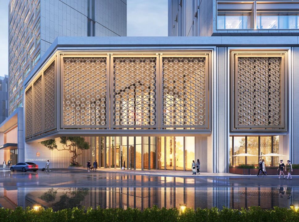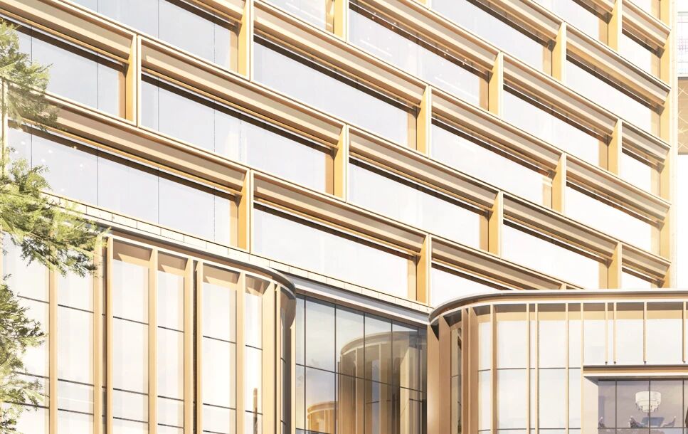 裙楼立面采用不规则错层的全明玻璃幕墙,饰以金属色泽的氟碳喷涂铝板,塑造出“步步登高”的现代建筑韵律。入口处则选用哑光石材、金属格栅与仿木纹铝合金,以古朴的精致细节与之呼应,展现出鲜明的古今交融特色。