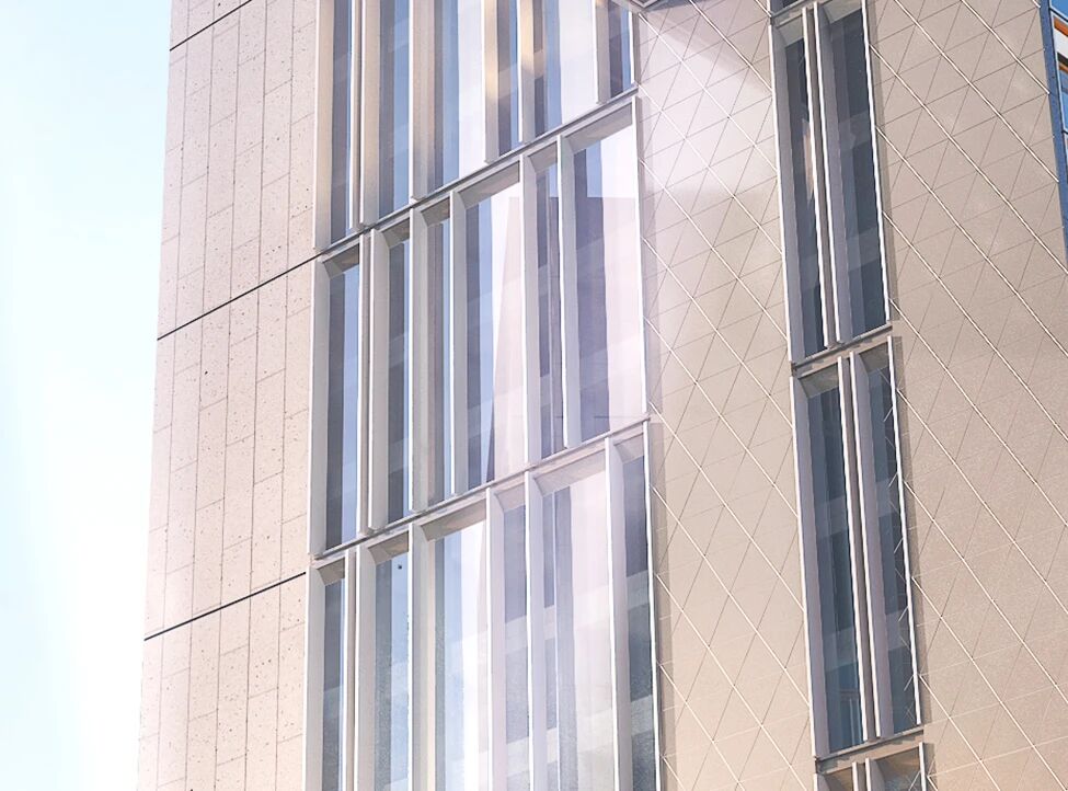 山墙位选用米白色仿石蜂窝铝板,表面经仿石辊涂压花处理,质感温润自然。该材料系统不仅大幅减轻幕墙自重,有效规避了天然石材的脱落风险,提升安全性;更以极佳的平整度、更高的材料利用率,在实现优质石材视觉效果的同时,践行了绿色可持续发展的理念;