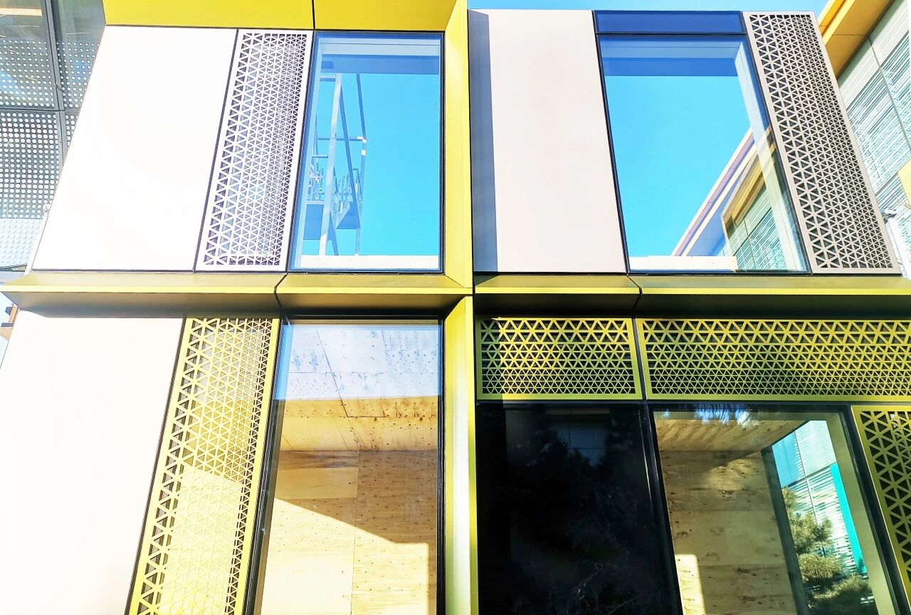 在真实建筑朝向的光照条件下,多角度观察玻璃的透射、反射效果,氧化铝板的色泽、质感与穿孔图案的整体性。
