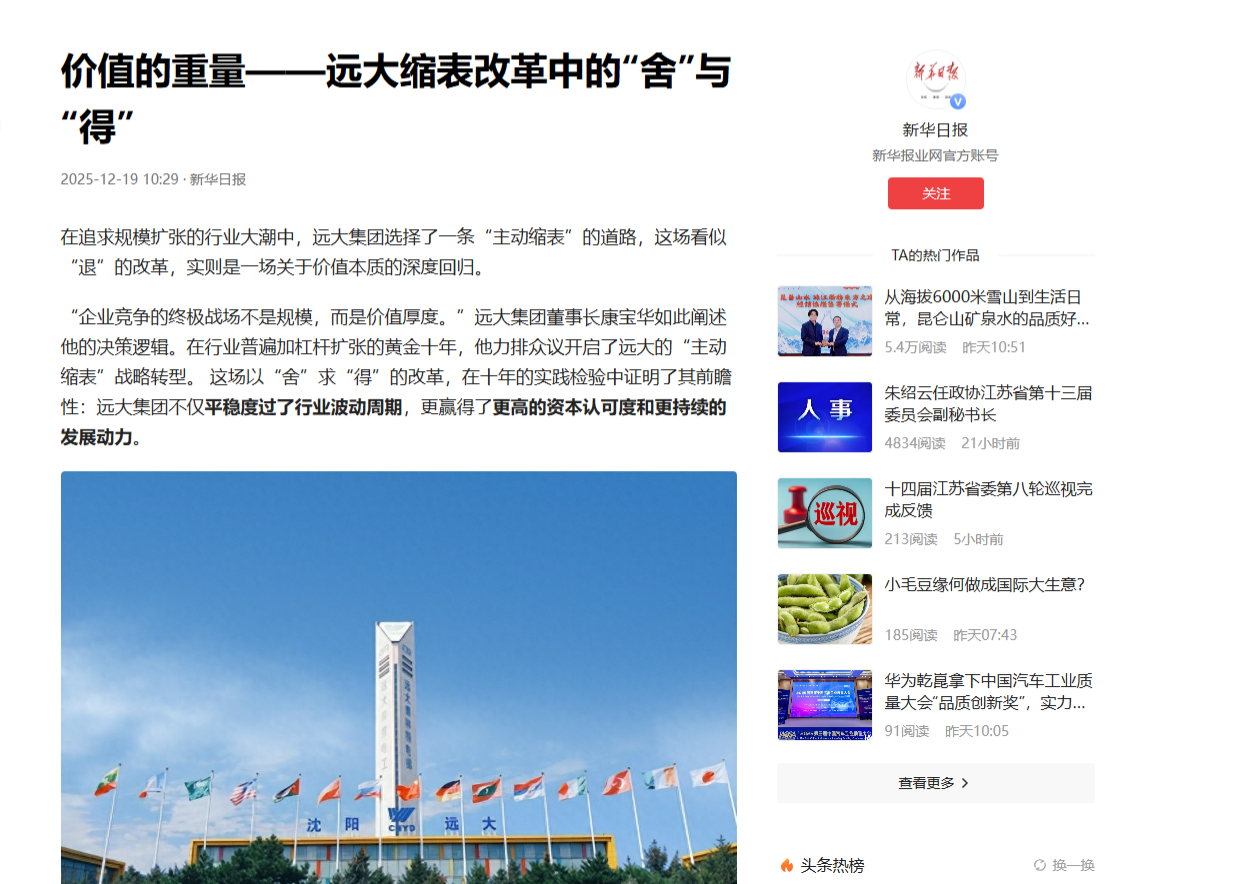 在康宝华的价值观中,企业的真正价值不在于规模大小,而在于其存在的意义和贡献。远大通过“缩表”改革舍弃了表面的繁华,赢得了内在的价值厚度。 这一路径印证了一个朴素而深刻的道理:有时候,敢于“舍”才能更好地“得”;放下负担,才能走得更远。在浮躁的商业环境中,远大集团以其战略定力和价值坚守,为中国企业提供了关于“价值重量”的生动诠释。