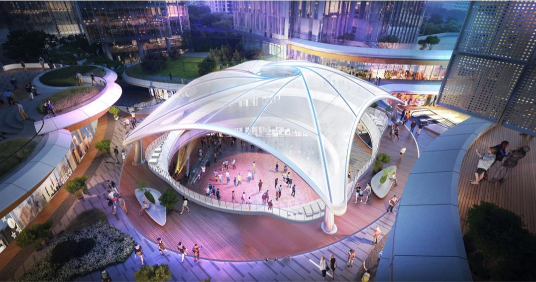 采用旋涡动感造型的膜结构,外圈由流线型异形金属檐口包围,中央区域创新性地运用ETFE气枕膜构成的双层膜结构,并配备智能充气系统。ETFE膜材透光却不压抑,尽管加工与安装工艺复杂,却极大地赋予了空间动态活力与轻盈质感。