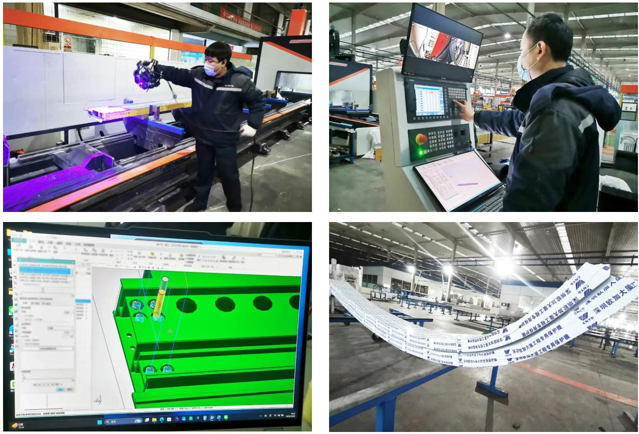 欧加大厦工期紧迫,为提升生产效率与工艺水准,远大生产团队创新研发五轴中心YDWJ预编程技术,利用专业软件将预编模型与扫描结果进行精准对比,通过预演碰撞与调控相融合,提升加工编程与机床运行的双重质效。这不仅突破了普通数控工人操控五轴中心的技术壁垒,更使设备效率得到200%提升。